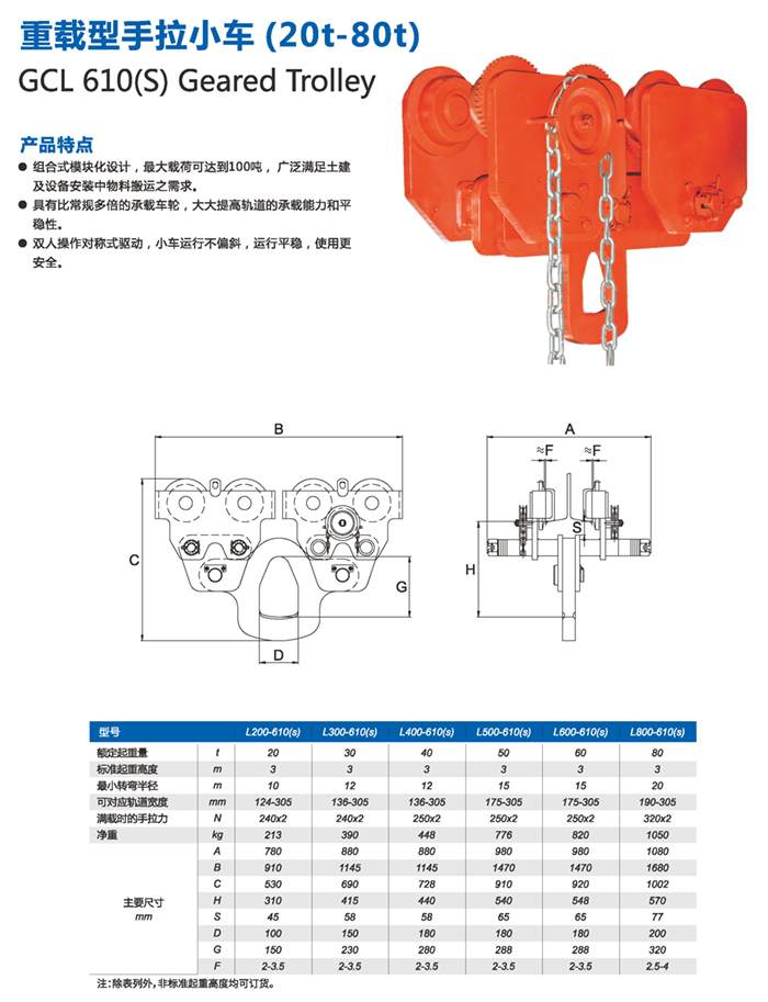 常規型手拉小車 GCL/GCT810系列小車選用了全新的高強度低合金結構鋼,確保4倍安全載荷,輕巧、安全、安裝方便、是目前最為輕巧小車之一。 1.采用優質鋼材,結構緊湊,外型美觀。 2.國際標準生產,安全性能可靠。 3.可多種選擇,“H”型鋼、“I”型鋼均可適用。