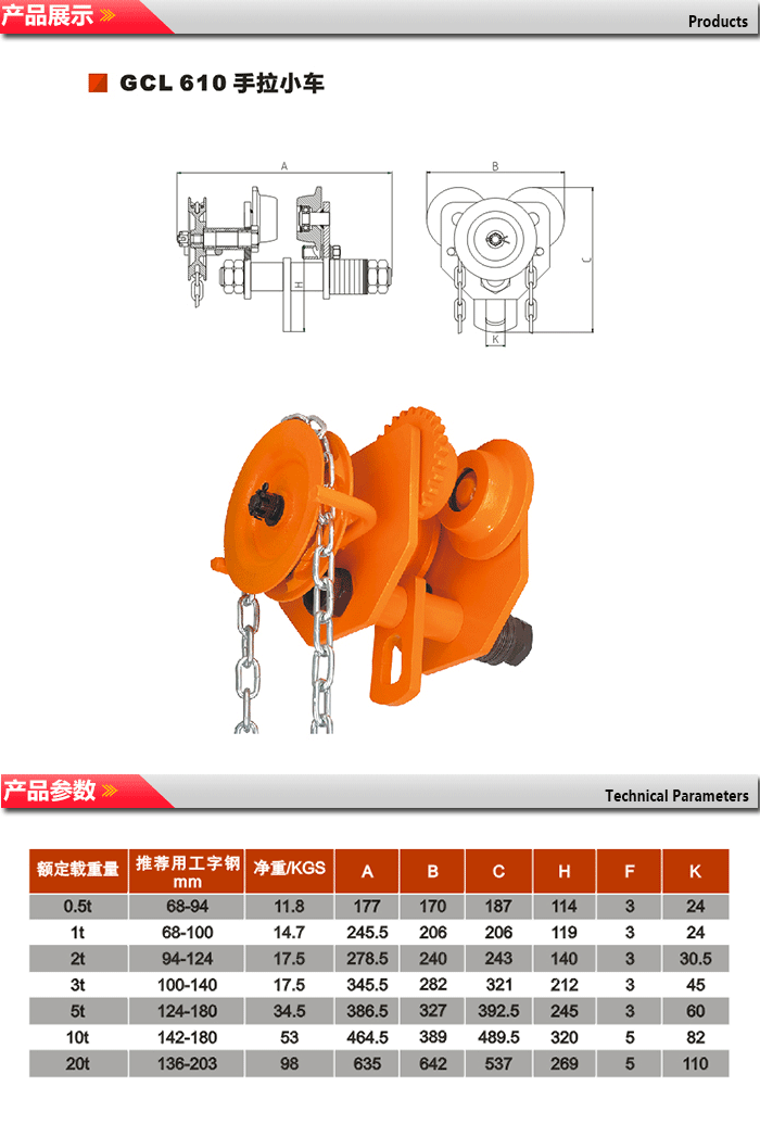 常規(guī)型手拉小車 GCL/GCT810系列小車選用了全新的高強度低合金結(jié)構(gòu)鋼,確保4倍安全載荷,輕巧、安全、安裝方便、是目前最為輕巧小車之一。 1.采用優(yōu)質(zhì)鋼材,結(jié)構(gòu)緊湊,外型美觀。 2.國際標準生產(chǎn),安全性能可靠。 3.可多種選擇,“H”型鋼、“I”型鋼均可適用。